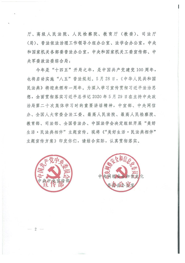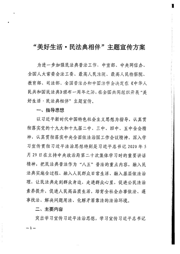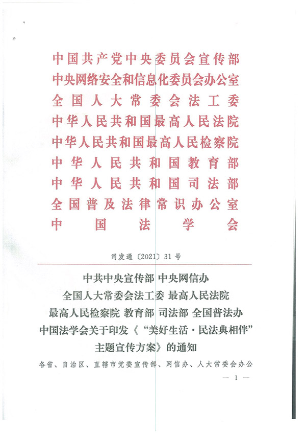 关于近日中宣部、中央网信办、全国人大常委会法工委、最高人民法院、最高人民检察院、教育部、司法部、全国普法办、中国法学会联合下发通知,印发《“美好生活·民法典相伴”主题宣传方案》的通知。