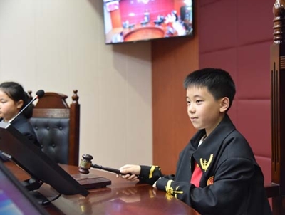 在资阳区法院模拟庭审现场,同学化身审判长、审判员等角色。
