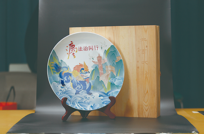 为了迎合主题,张正平和他的团队还创作了采用中国法律图腾“獬豸”制作的挂盘,“法治五彩茶香”茶杯等作品,将传统法治文化与现代装饰艺术相融合。