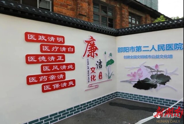 在邵阳市第二人民医院的门诊大楼旁,一面长达24米的“廉洁文化长廊”吸引了过往行人的注意,一句句耳熟能详的廉洁箴言,一个个医者仁心的感人故事,让医护人员和市民在步履匆匆之间也感受到廉政文化的熏陶,这面文化墙,通过图文并茂的形式,将清廉教育的知识性、教育性和警示性融为一体,形成一道靓丽的廉洁文化风景。