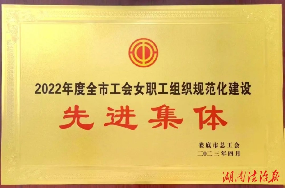 湖南法治报讯(通讯员 李玲)2023年6月26日,娄底市总工会对2022年度全市工会女职工组织规范化建设示范集体、先进集体和女职工工作先进个人进行通报表彰,娄底市中级人民法院工会女职工委员会荣获先进集体。