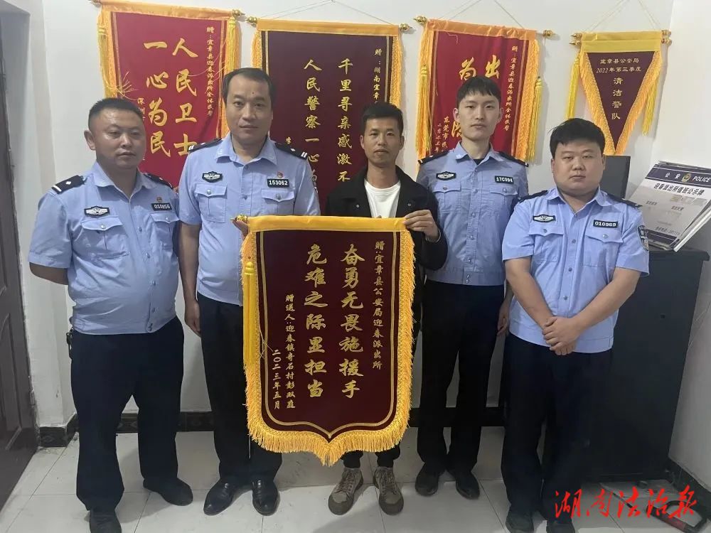 湖南法治报讯(通讯员 李平)2023年5月9日,宜章县迎春镇崎石村彭先生将一面印有“奋勇无畏施援手 危难之际显担当”的锦旗送到迎春派出所。