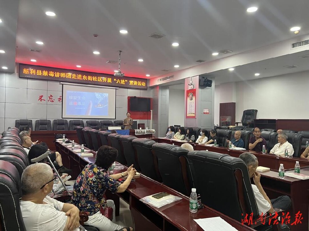湖南法治报讯(通讯员 刘风云)为全面推动新时代社会禁毒工作的开展,传播禁毒理念,宣传禁毒政策,增强党员、居民群众禁毒意识,提升自觉抵制毒品侵袭的能力,营造全民参与禁毒宣传的浓厚氛围。6月30日,在慈利县禁毒办、县民政局、县社会组织委员会的指导下,县人大代表、协会党支部名誉书记、会长刘永岗组织禁毒教育讲师团、禁毒志愿者前往零阳街道东街社区开展“六进”宣讲活动,社区党委全体党员、学生及群众代表等一百余人参加。