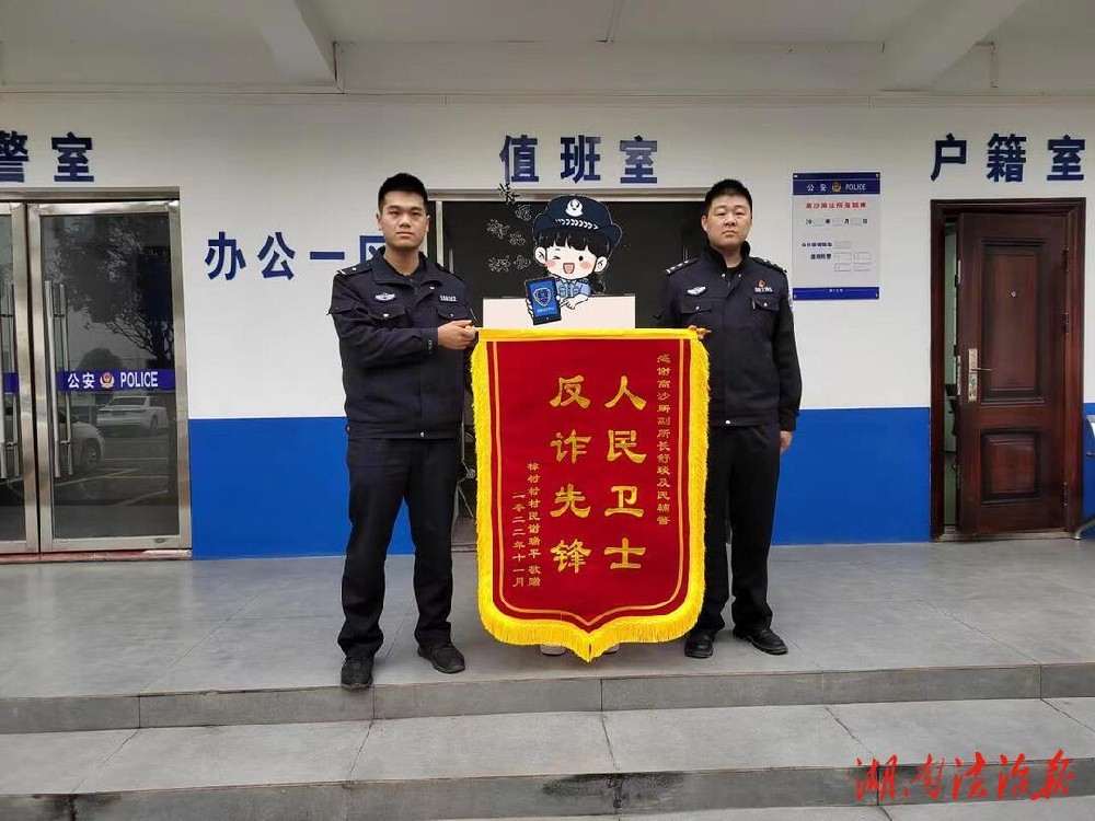 11月17日下午15时许,辖区居民谢女士将一面写有“人民卫士 反诈先锋”的锦旗送到洞口县公安局高沙派出所,感谢民辅警及时劝阻自己转账,避免资金损失。