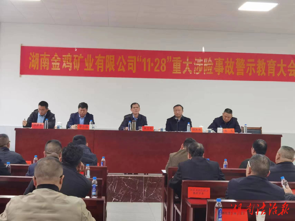 会议通报了湖南金鸡矿业有限公司“11·28”重大涉险事故有关情况,煤矿主要负责人作检讨发言。