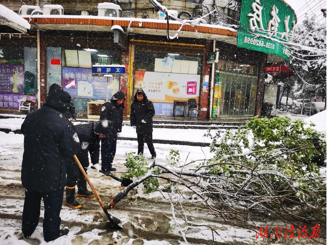 永丰水陆派出所民警、辅警将大雪压断的树枝搬离,确保路面畅通。