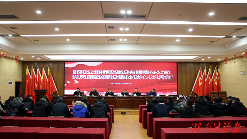 湖南法治报讯(通讯员 罗杉艳 陈俊晔)为深入推动全面从严治党向纵深发展,切实抓好春节期间领导干部教育和管理工作,2月6日下午,邵阳公路桥梁建设有限责任公司(以下简称“邵阳路桥”)开展党风廉政建设集体谈心谈话会。党委副书记、总经理雷新斌对与会人员开展谈心谈话。纪检书记郑达波主持会议,公司领导班子成员、各部门经理、各下属公司班子成员和各在邵项目经理共40余人参加。
