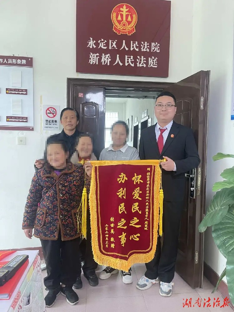 湖南法治报讯(通讯员 周楚远) “感谢法官让我心里的石头落地了!”近日,年近八旬的张奶奶将一面印有“怀爱民之心、办利民之事”的锦旗交到新桥法庭负责人周楚远手中,对人民法庭用心服务的工作作风及认真负责的工作态度表示感谢。