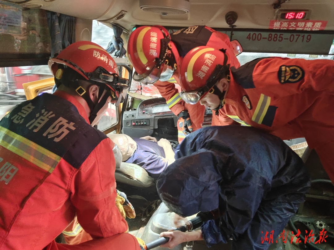湖南法治报讯(通讯员 唐金娟)“喂,你好!我要报警,邵东市廉桥镇白马铺村320国道路段发生一起交通事故,有个人被卡在车子里面了”。4月2日14时46分,邵东市消防救援大队指挥中心接到报警后,立即调派衡宝路消防救援站2车14人赶赴现场处置。