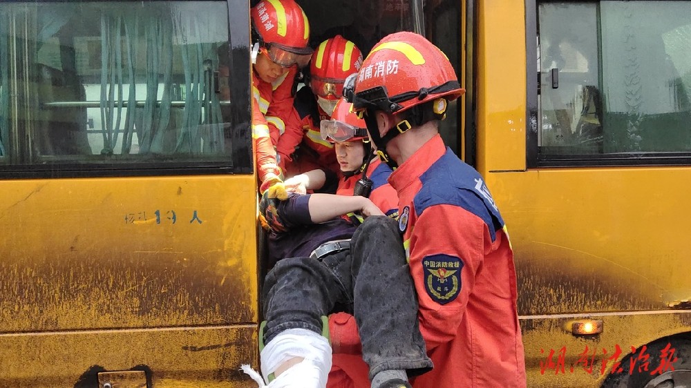 15时07分消防救援人员到达现场。经侦查询问得知:由于暴雨天气,十字路口突然驶出一辆货车,中巴车司机因行车视线受阻,导致避险不及时而撞上货车车尾,由于巨大的撞击力,使中巴车车头发生变形,驾驶员双腿卡在驾驶室无法动弹,驾驶员意识已经逐渐模糊,情况十分危急。