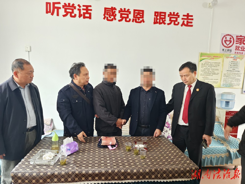 执行局局长曹庚雄决定多方联动,邀请资兴市党代表欧教兵和兴宁镇司法所所长谢邡雄共同参与见证执行,并与支村两委干部再次组织双方和解,经过大家2个多小时的努力,双方打开心结,握手言和,案件得以圆满执结。