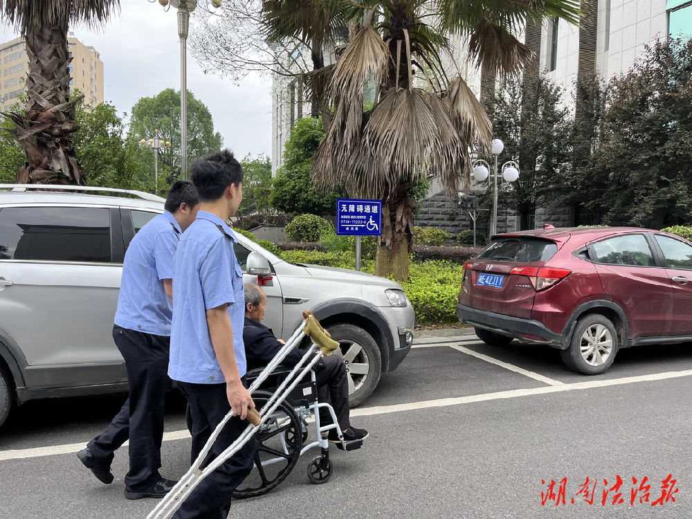 湖南法治报讯(通讯员 蒋志龙 付军慧 唐梅妍)5月7日上午,一位年龄较大的当事人前来洞口法院咨询立案相关业务,通过法院安检通道后,突然停在机关大楼台阶前,安检带班法警发现这一情况,立即上前询问,得知老人由于身体状况导致腿脚不便于行走。随即,带班法警与当天负责安保巡逻组法警进行联系。巡逻法警收到消息立即推来便民轮椅,和当事人进行简单沟通后,便通过无障碍通道将其护送至立案大厅。等待老人办理完相关业务,巡逻法警又将其安全护送至法院大门口。“真的非常感谢你们,今天没有你们的帮助我都不知道该怎么办,为你们的服务点赞”。离开时,老人向一旁的法警竖起大拇指。