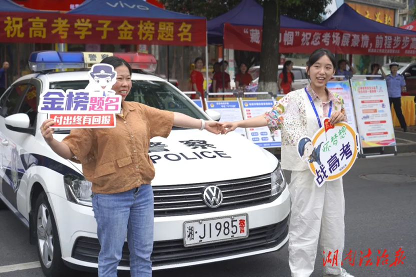 桃源公安特意派出谐音为“就要985”的湘J1985警车为桃源学子加油打气,引发学生和家长们争相合影,沾沾“喜气”。