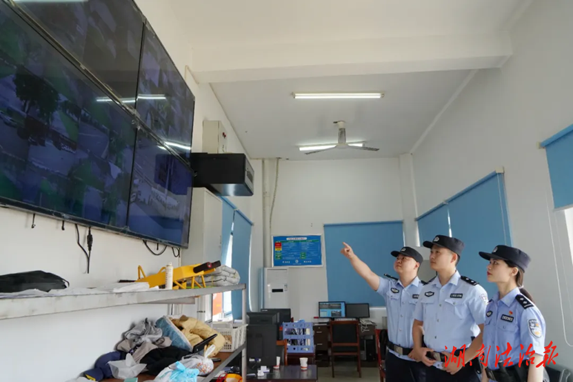 民警们查看考点监控、安保设施,为考生们消除安全隐患。
