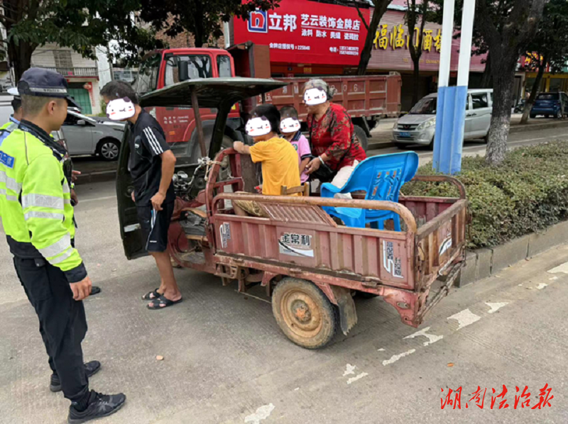 湖南法治报讯(通讯员 何斌 杨玲)7月21日,道县公安局交警大队濂溪中队民警在道县道州中路爱莲商业广场路段执勤时,发现前方驶来一辆破旧的无牌三轮车,该车后厢上用椅子搭乘着一名老奶奶和2名幼童,开车的是一名70来岁的老爷爷。见状,民警立即上前将该车拦停检查。经询问驾驶人王某系营江街道某村人,车上搭乘人员系他的妻子和2个孙子,因到县城购物,为图方便,遂用该车作为交通工具。民警查明驾驶人王某存有违法载人、驾驶电动三轮车未佩戴安全头盔等行为。