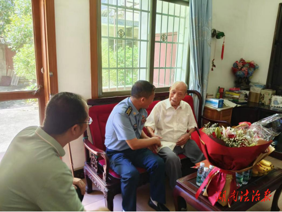 湖南法治报讯(通讯员 陈莉)7月30日,在“八一”建军节到来之际,衡阳市石鼓区人武部、区军退局、合江街道及江雁社区退役军人服务站一行,走访慰问了辖区百岁高龄退役军人许光裕老人,向他致以节日的问候和崇高敬意。