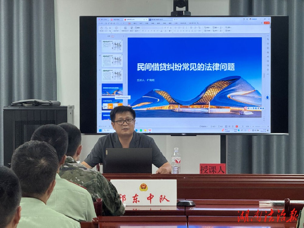 活动现场,祁东法院民二庭庭长旷有明围绕《民法典》等相关法律,针对官兵们最关注的婚姻家庭、民间借贷等热点法律问题进行详细讲解,通过以案释法的方式,结合工作实际,在轻松愉悦的氛围中讲授法律知识,极大地提升了普法宣讲的实效性和针对性。