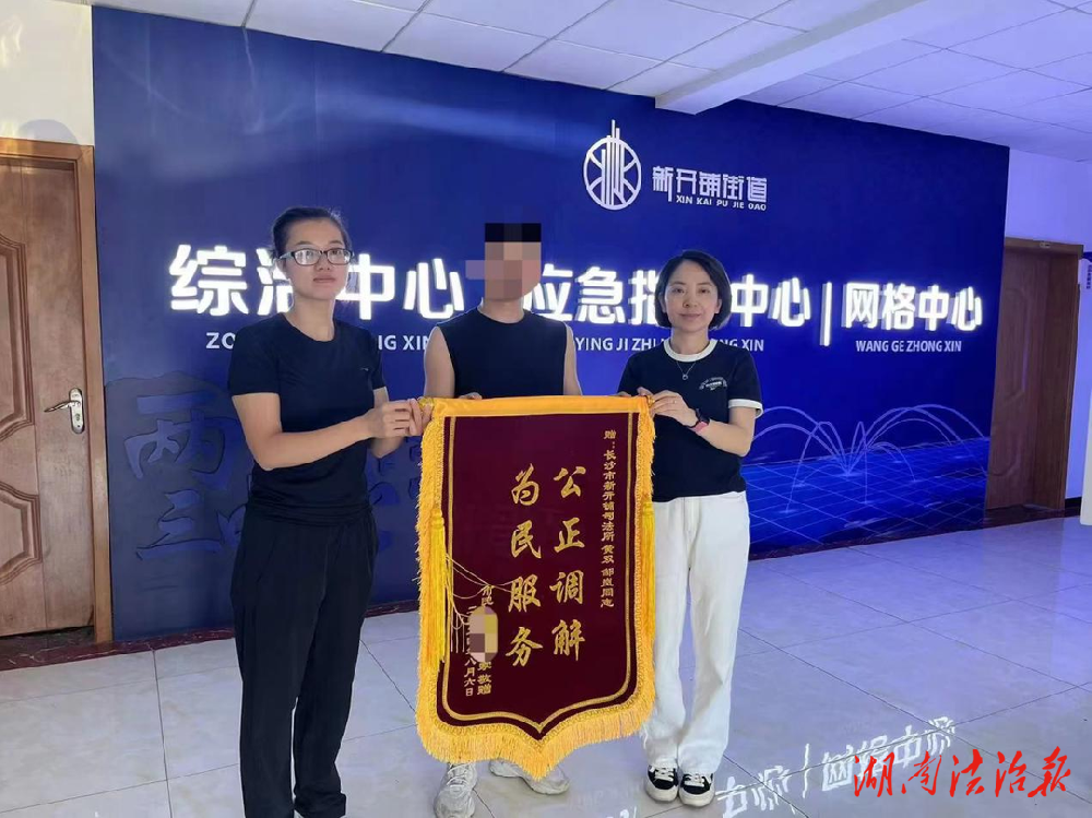 湖南法治报讯(通讯员 刘依蕾)“真心感谢街道司法所尽心尽力、及时高效地为我们调处纠纷,了结了我们的忧愁事!”8月6日上午,人民群众顶着炎炎烈日,来到长沙市天心区新开铺街道司法所,为司法所负责人黄双和人民调解员邹岚送来“公正调解 为民服务”的锦旗。