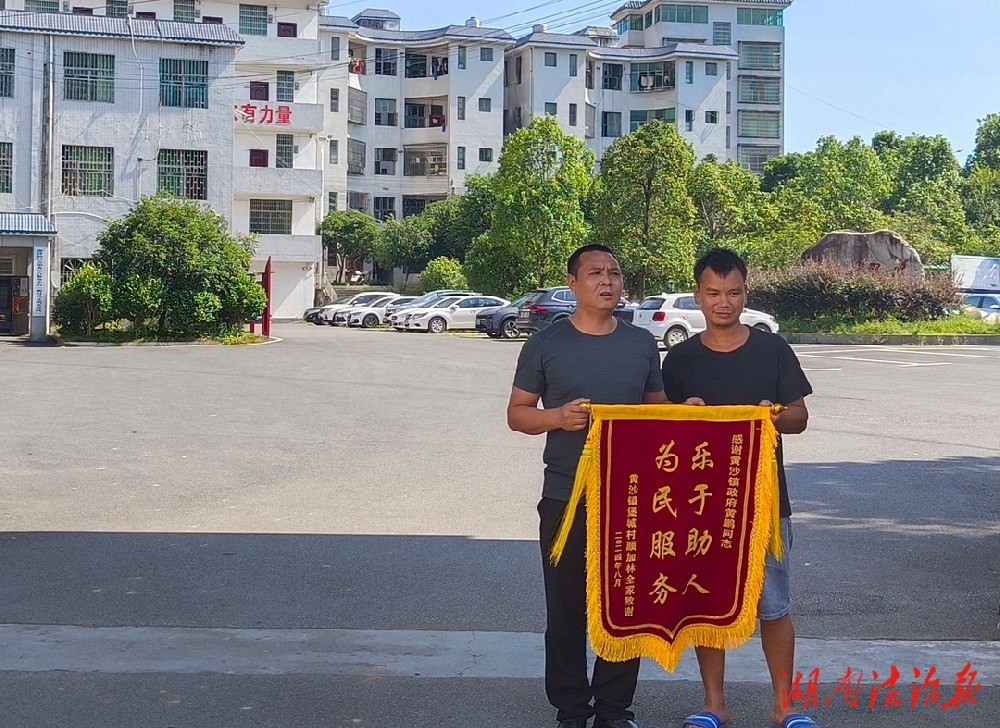 湖南法治报讯(通讯员 黄展徕 李厚桥)8月6日上午九点半,宜章县黄沙镇政府院内上演暖心一幕,该镇堡城村村民颜加林将一面印有“乐于助人 为民服务”的锦旗送到该镇干部黄鹏的手中,并说道:“谢谢您,要不是您及时救助,我伯伯可就危险了!”