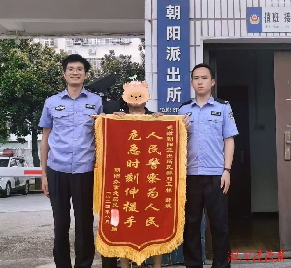 湖南法治报讯(通讯员 蒋露)一面锦旗,一种肯定,一声感谢,一份责任。“四位警官,真的太感谢你们了,你们不仅救了我妹妹,更拯救了我们整个家庭。”2024年8月14日,朝阳派出所收到辖区居民送来的一面写有“人民警察为人民 危急时刻伸援手”的锦旗和一条感谢短信,以此表达他们对刘玉林、邹斌两位辅警奋不顾身,英勇救人的义举之恩。