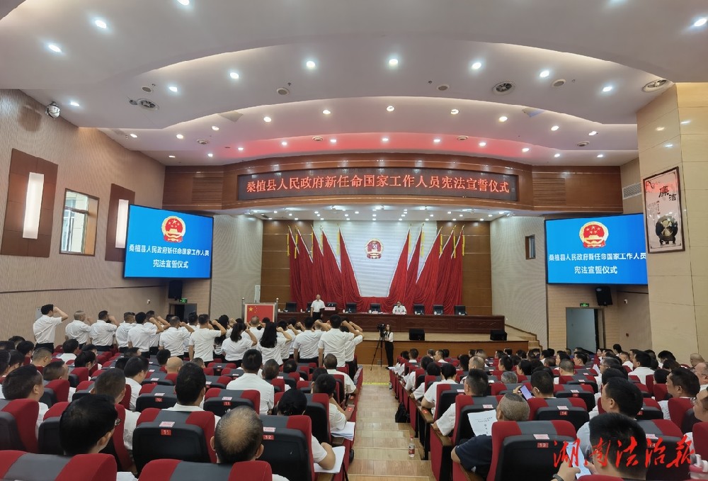 湖南法治报讯(通讯员 向春月)“我宣誓:忠于中华人民共和国宪法,维护宪法权威,履行法定职责,忠于祖国、忠于人民,恪尽职守、廉洁奉公......”。2024年8月16日,桑植县人民政府举行新任命国家工作人员宪法宣誓仪式,55名国家工作人员依法进行宣誓,县委副书记、县长梁高武监誓。