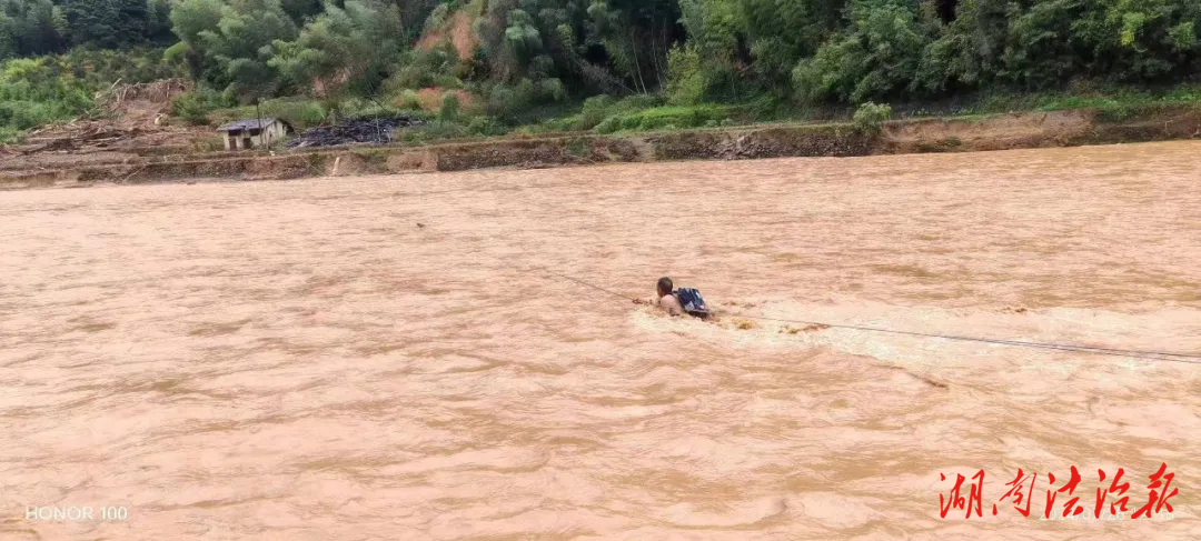 庞彪说自己有办法过河,那就是借助垂吊在河上的电线,横渡激流。庞彪背着物资,牢牢抓住电线,缓缓向河对岸游过去,一刻也不敢撒手。河中间有些上游冲下来的石头,导致河床高矮不平,浑浊的河水又让他看不见脚底下的情况,一不小心,庞彪随时可能被水流冲走。在河岸上的赵英以及其他村民都为他捏了一把汗。