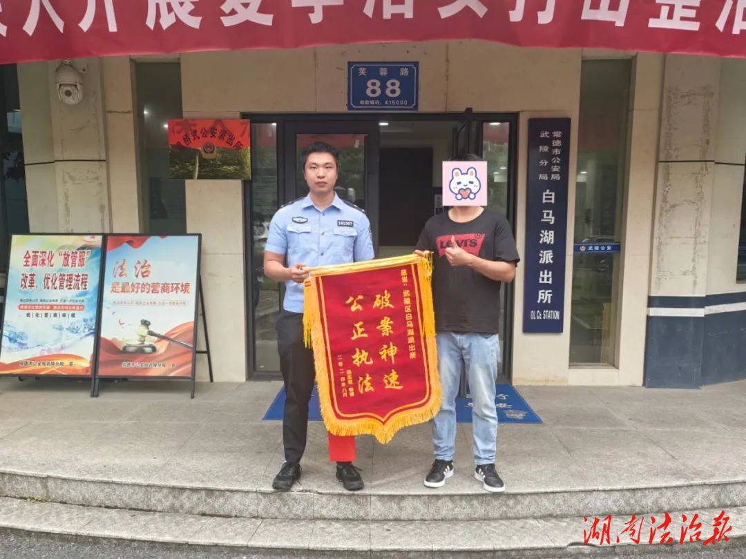 8月2日,受害人家属将一面印着“破案神速 公正执法”的锦旗送至办案民警手中,感谢民警帮其挽回损失