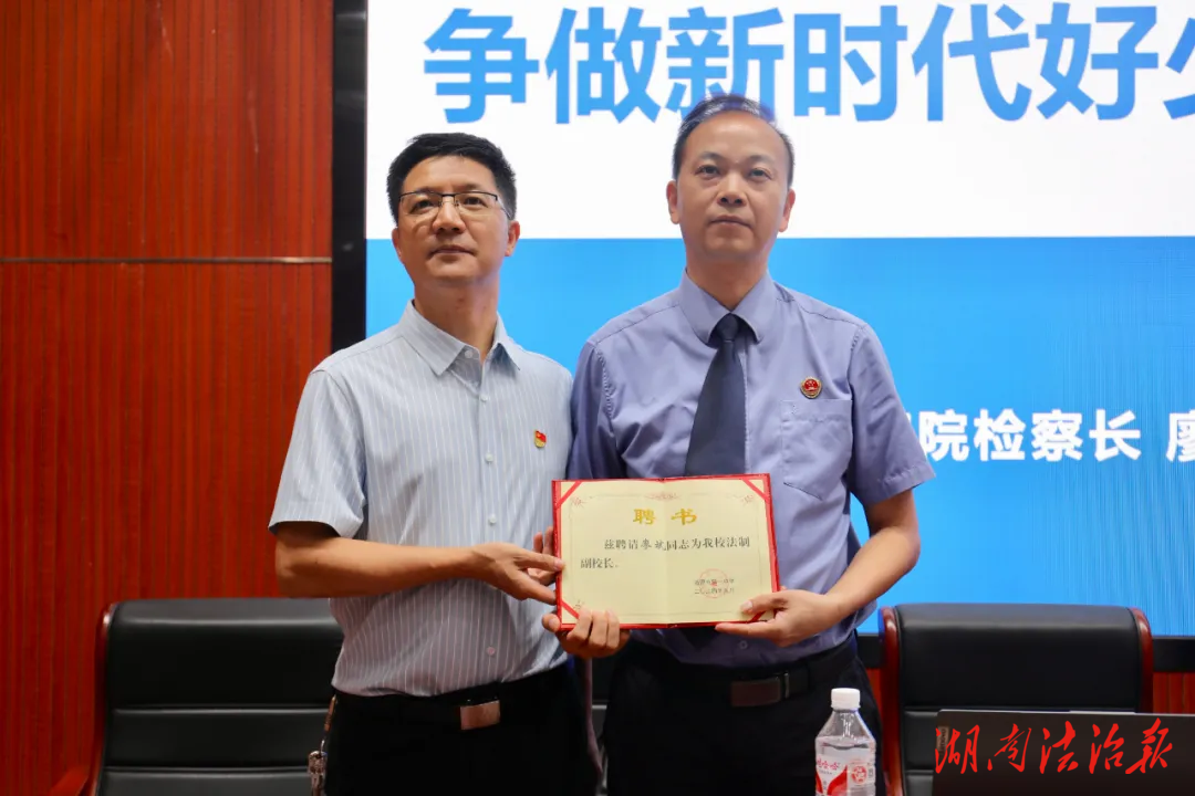 涟源市第一中学党委书记梁丹为涟源市人民检察院党组书记、检察长廖斌颁发聘书
