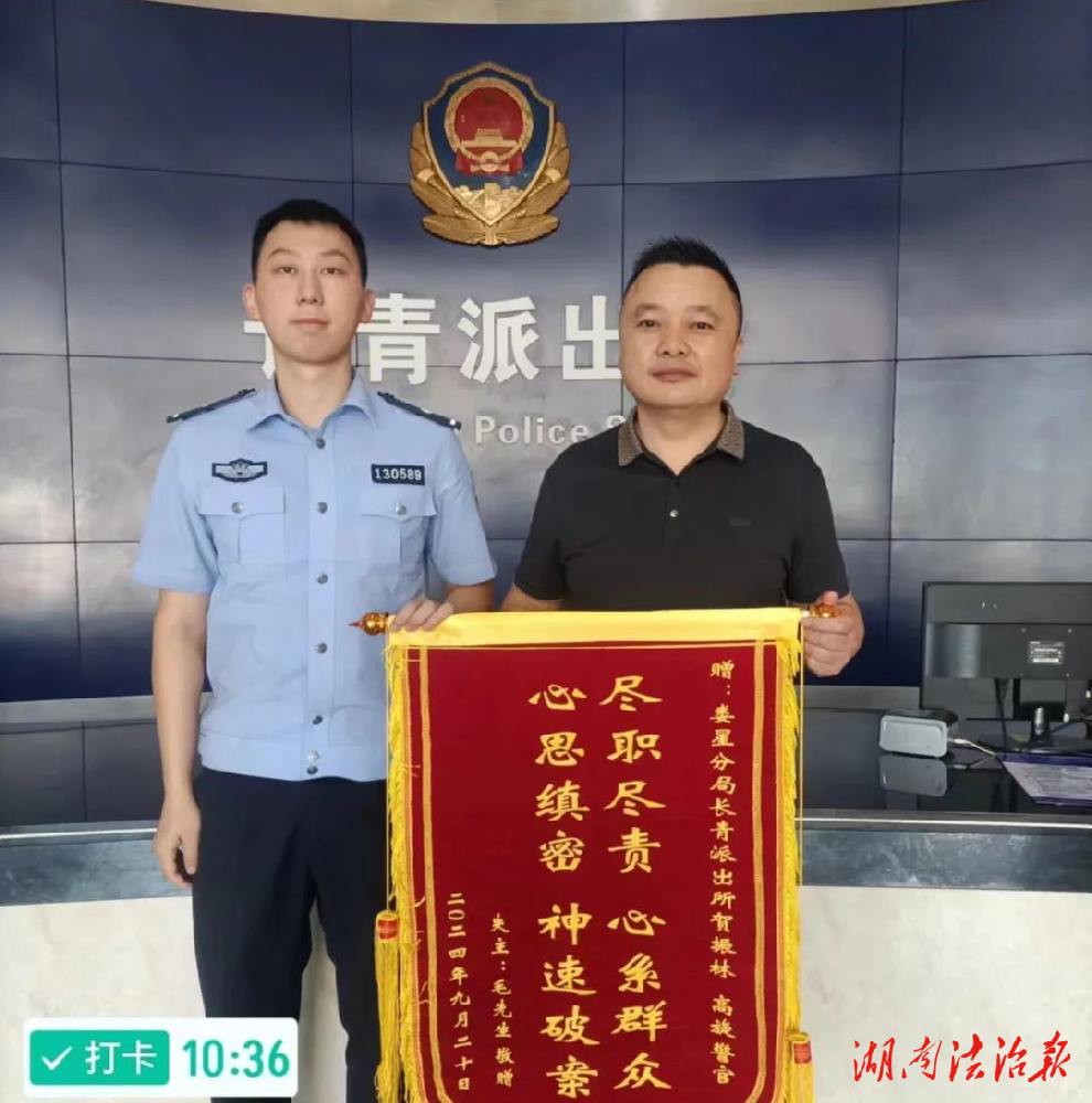 湖南法治报讯(通讯员 刘艳妍)9月23日,群众毛先生将一面印有“尽职尽责 心系群众,心思缜密 神速破案”的锦旗送到娄底市公安局娄星分局长青派出所,感谢民警帮助其找回被盗财物。