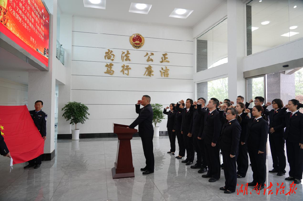 在党组书记、检察长曹金辉的领誓下,全院检察干警、书记员整齐列队、高举右拳、面向国旗,郑重宣誓--