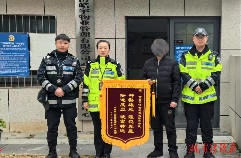 湖南法治报讯(通讯员 麻琼)1月14日11时,物业管理有限公司负责人将一面写有“神警雄风 罪犯克星 快速反应 破案神速”的锦旗交到吉首市公安局交巡警五中队的队员手中,向他们快速反应,成功抓获两名撬门嫌疑人,保障小区业主人身及财产安全的行为表示感谢。