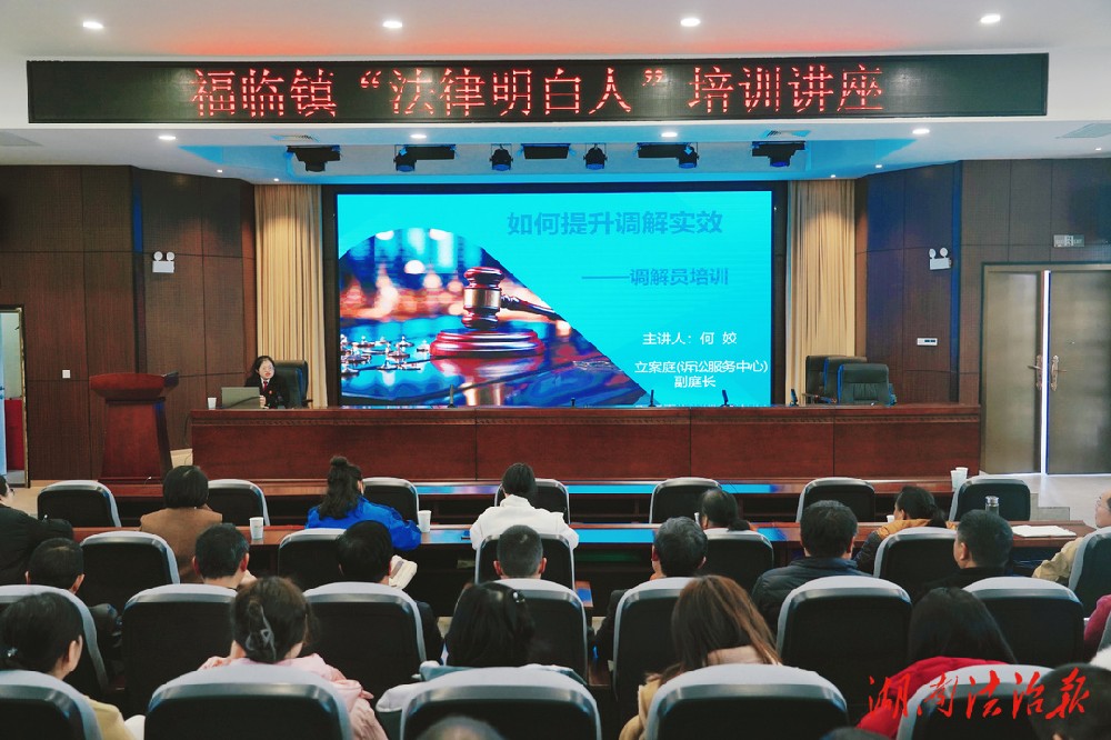 湖南法治报讯(通讯员 李顺璋)为进一步做实指导调解法定职能,切实促推基层矛盾源头预防、就地化解,2月27日下午,长沙县法院立案庭(诉讼服务中心)副庭长何姣来到福临镇人民政府,为三十余名“法律明白人”带来了一堂精彩的培训课。
