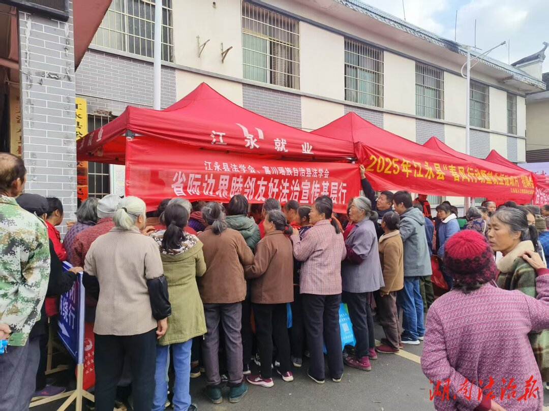 江永县司法局充分利用“赶鸟节”民俗传统,携手邀请广西富川瑶族自治县司法局共同举办“省际边界法治睦邻廊道边界行”普法活动启动仪式:“赶鸟节”场上人山人海,盛况空前。两县法学专家共同宣讲《中华人民共和国宪法》《中华人民共和国民法典》;大学生志愿者向来往瑶胞发放土地管理法、山林权属纠纷处理办法、野生动植物保护、千年鸟道保护、禁毒、防电诈等宣传资料。法润三湘律师解答群众法律法规,广大瑶胞在欢庆佳节的热烈气氛中感受了法治盛宴,江永县20多个行政执法单位共同参与这次盛大法宣活动。