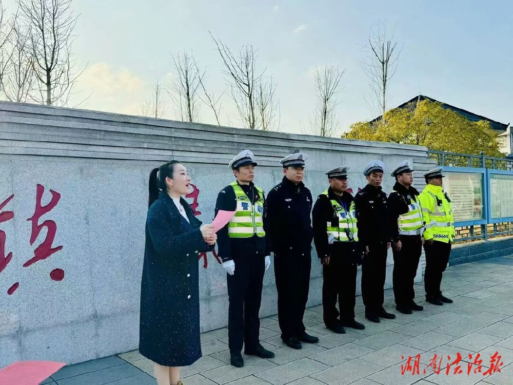 "无论严寒酷暑,交警叔叔们始终以挺拔的身姿、专业的指挥,为我校近两千名学生开辟出一条安全通道。"学生代表1901中队郭维桢诵读感谢信。