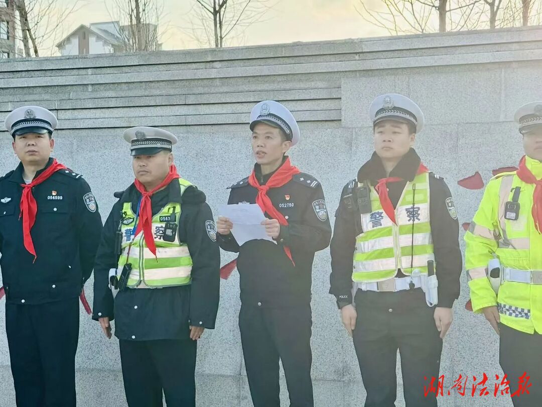 六年级少先队员代表为交警叔叔佩戴上鲜艳的红领巾。这一刻,责任与童真相映生辉,安全守护有了最温暖的纽带。