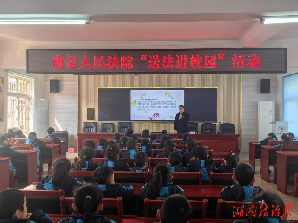 湖南法治报讯(通讯员 蔡瑛)近日,南县人民法院少年法庭负责人走进南县南洲镇第二完全小学开展“送法进校园”活动,为在校学生们送上专题法治课,以进一步加强青少年法治宣传教育,切实提高未成年人的法治意识和自我防范意识,积极营造安全和谐的校园环境。