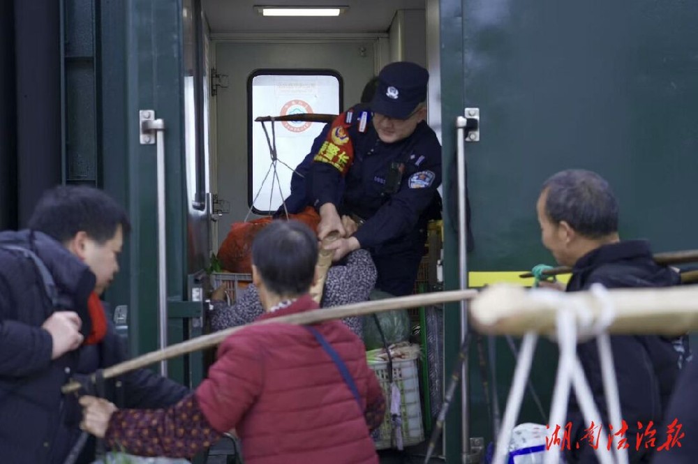 8点01分,列车缓缓驶入锦和车站站台后,怀化铁路公安处乘警王二雄马上从车上到站台上,看到一位挑着沉重单担的农民,他立刻迎上前去帮忙,“大叔,我来帮您,小心脚下!”他一边说着,一边接过一位大叔肩头的担子,稳稳地搬上火车。