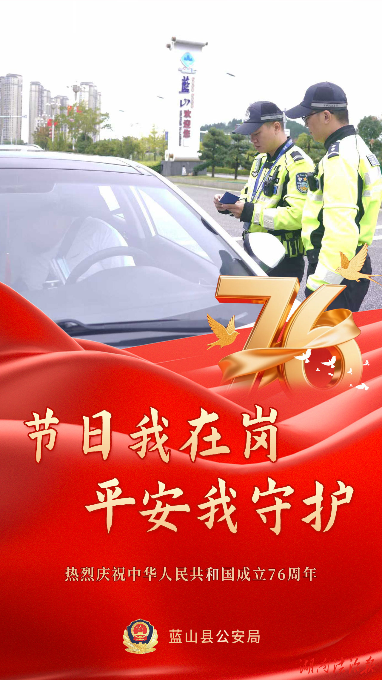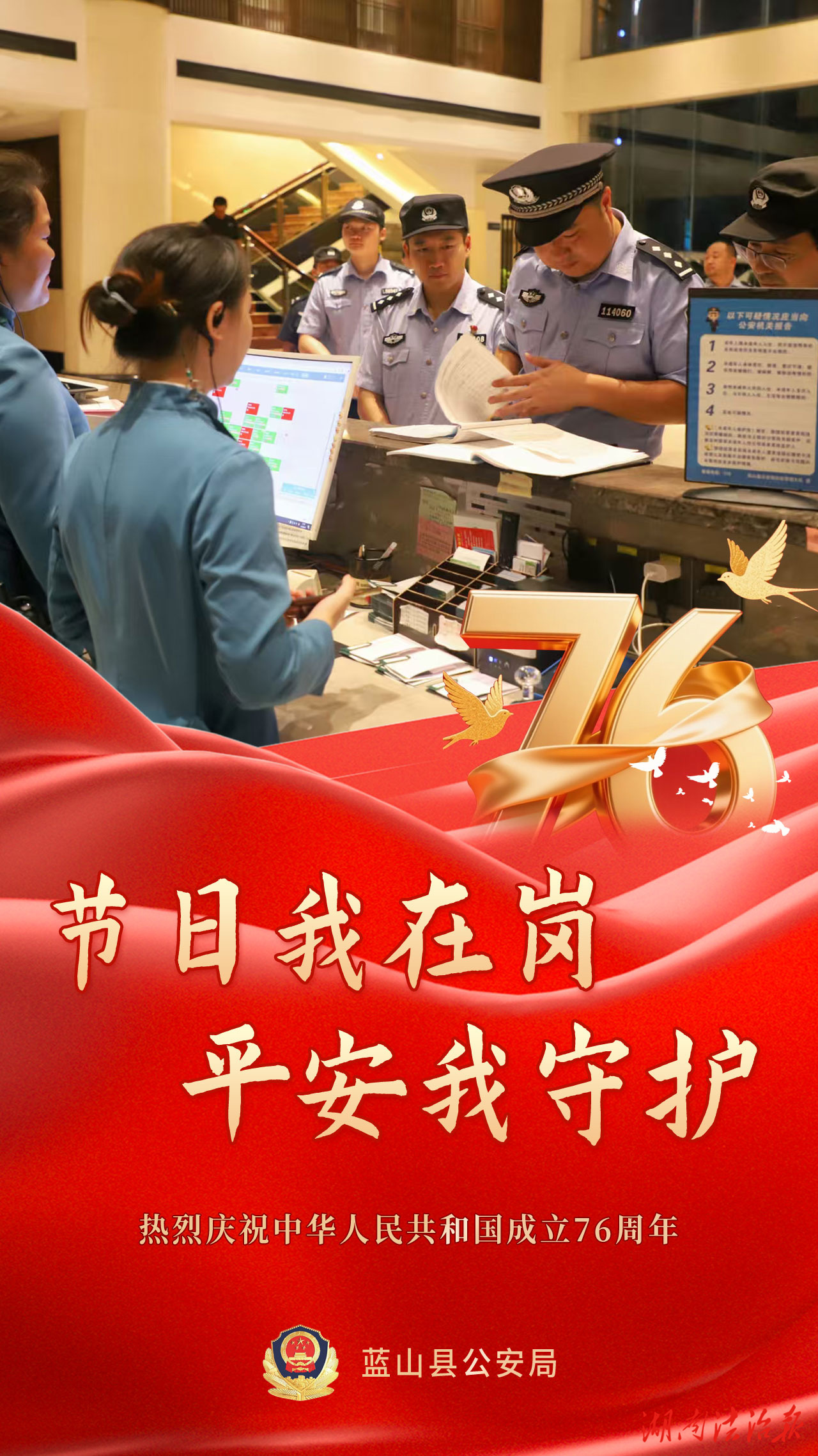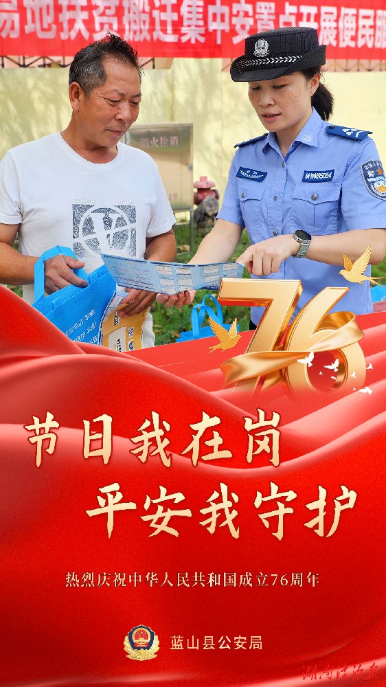 湖南法治报讯(通讯员 胡雯)有一种骄傲叫“中国红”,有一种守护叫“警察蓝”,双节假期,除了一幅幅闪耀的“中国红”,还有一抹抹醒目的“警察蓝”。在你看得见或看不见的地方,守护着千家万户的幸福,蓝山公安在岗位上,持续为您守护。举国欢庆的日子里,我们是别样的“警”色。