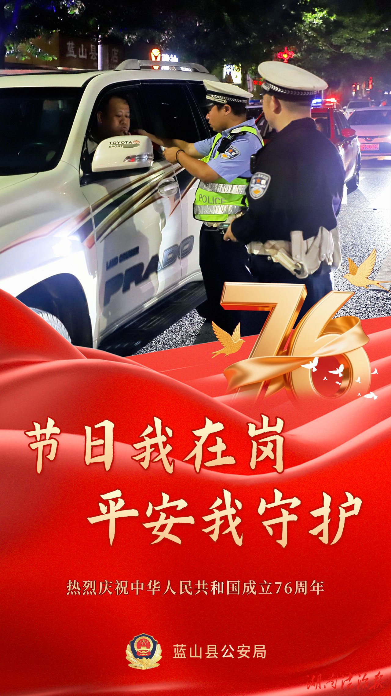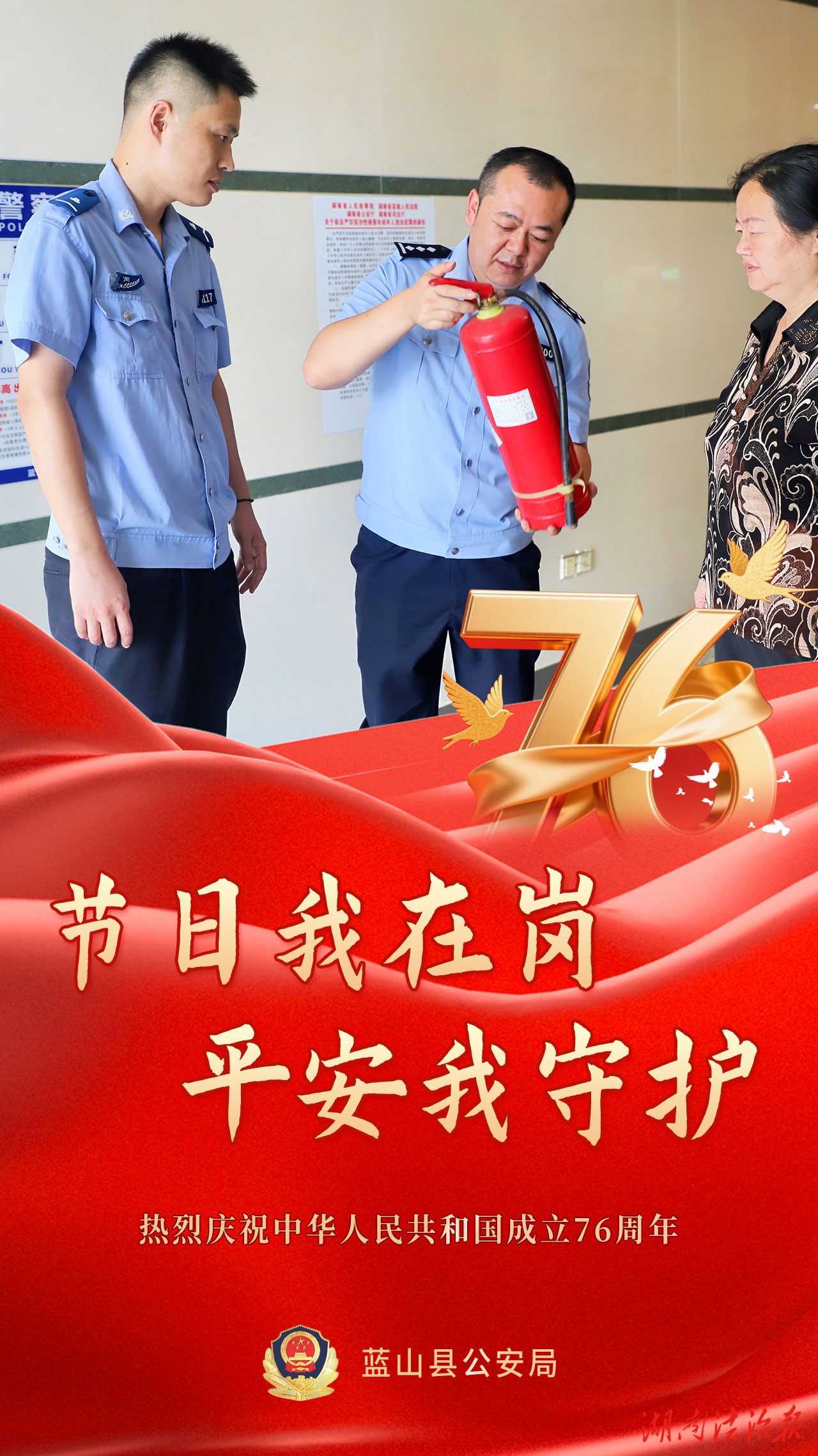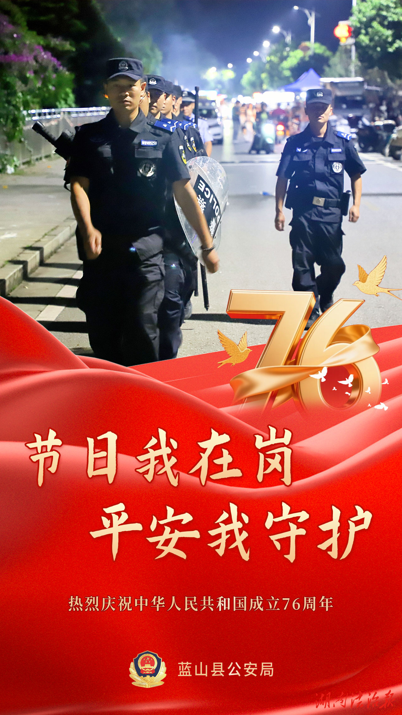 湖南法治报讯(通讯员 胡雯)有一种骄傲叫“中国红”,有一种守护叫“警察蓝”,双节假期,除了一幅幅闪耀的“中国红”,还有一抹抹醒目的“警察蓝”。在你看得见或看不见的地方,守护着千家万户的幸福,蓝山公安在岗位上,持续为您守护。举国欢庆的日子里,我们是别样的“警”色。