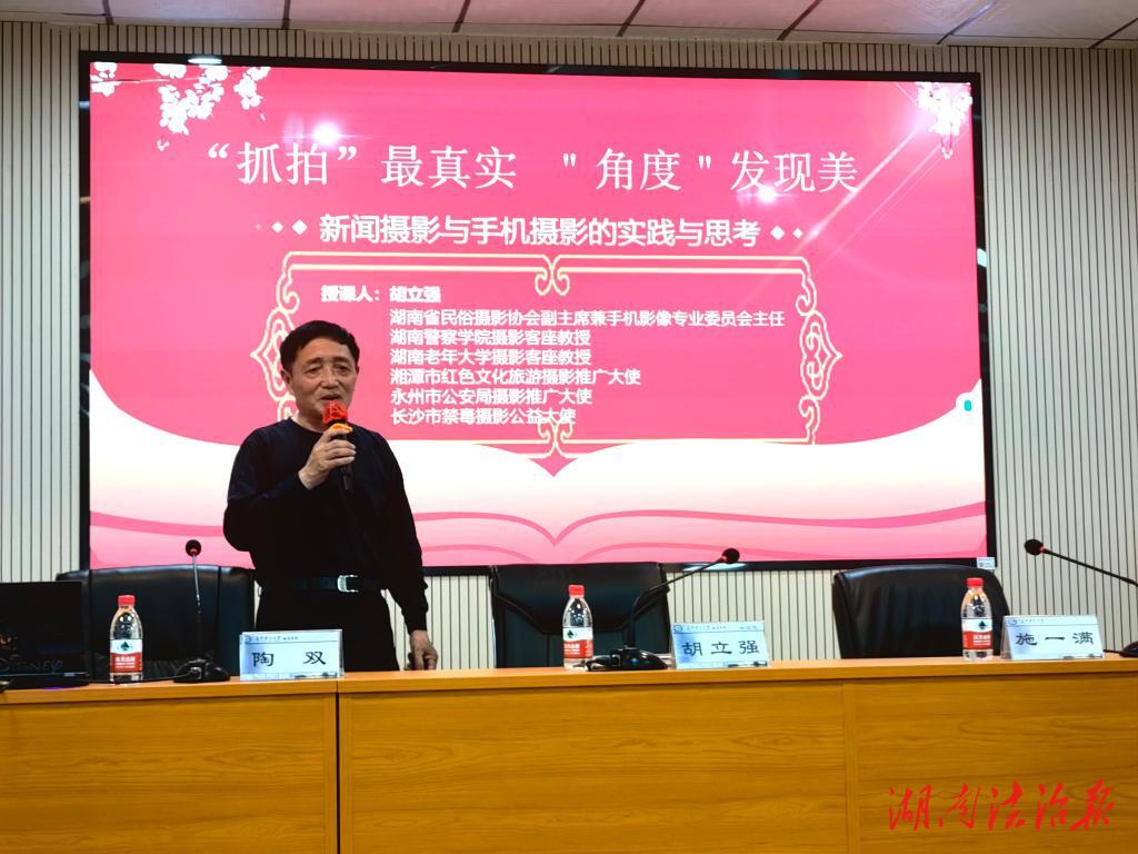 湖南法治报讯(通讯员 陈竹/文 谭恺睿/图)4月21日,长沙理工大学城南学院邀请湖南省民俗摄影协会副会长胡立强开展以“抓拍最真实‘角度’发现美”为题的精彩公益讲座,引导在校师生了解新闻摄影与手机摄影的技巧,多角度培养学生综合实践能力。活动由学院党委副书记陶双主持。