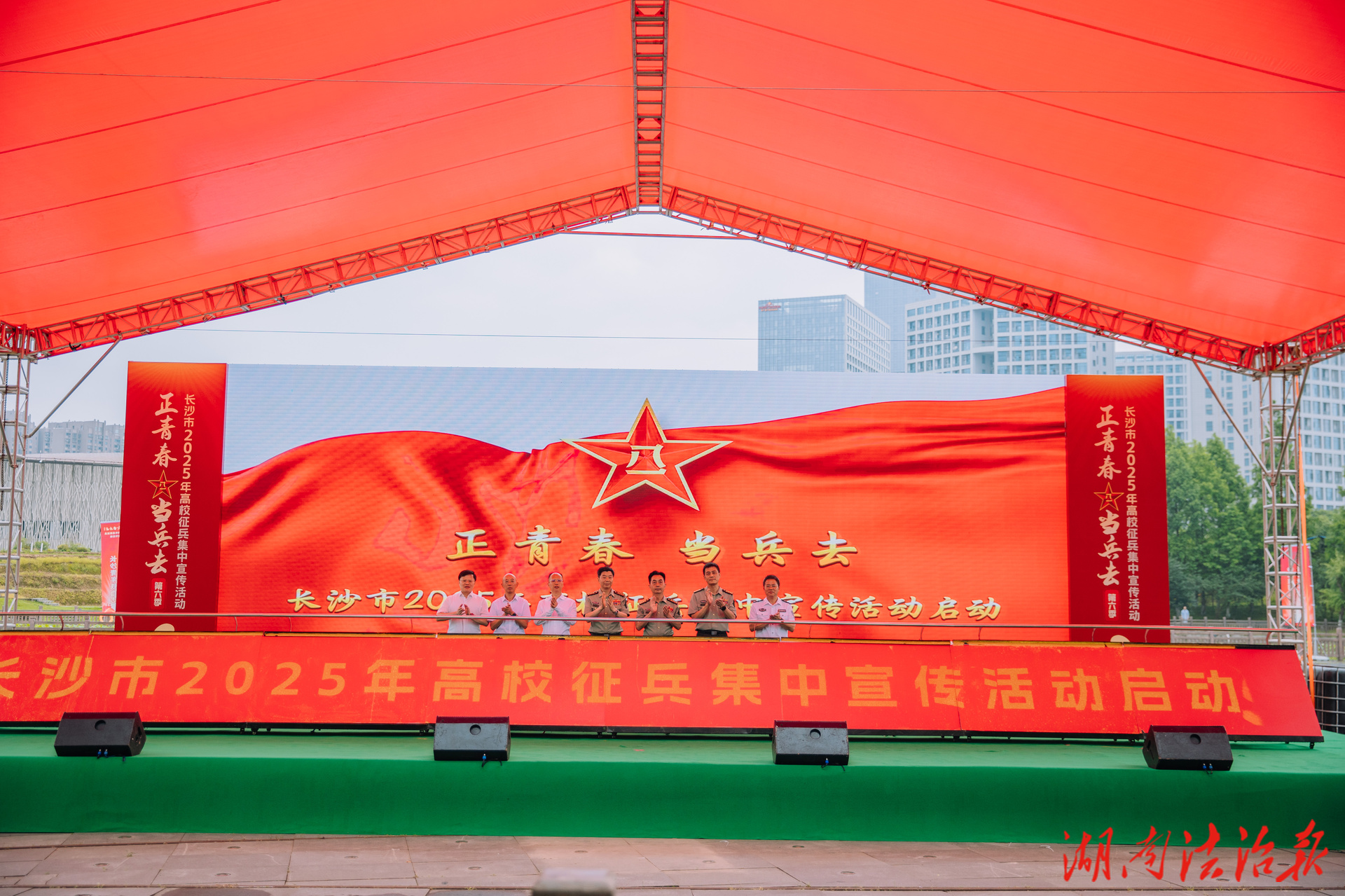 随着倒计时结束,参会领导集体推动启动杆,宣布长沙市2025年高校征兵集中宣传活动正式启动,将现场的热烈气氛推向最高潮。