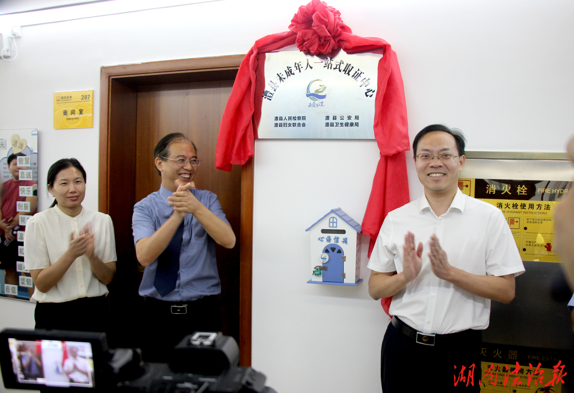 活动中,工作人员分组带领与会人员参观了品牌阵地,重点介绍“一站式”取证中心和心理辅导室。邓为方、杨仲、舒春初、黄杰在全体与会人员的注目下,共同为“未爱有澧”未成年人检察品牌揭牌。