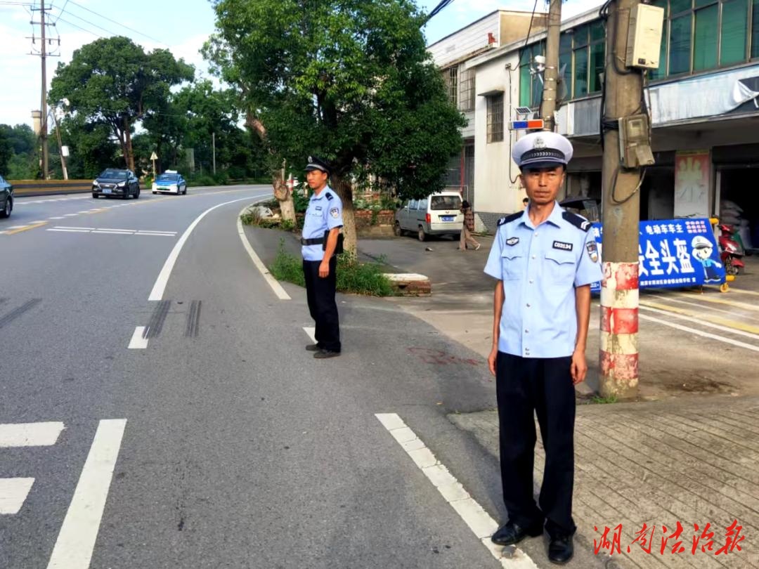 6月30日,湘潭市雨湖区发布高温黄色预警。当日11时,交警支队雨湖大队六中队辅警周剑、涂亮前往湘潭生物机电学校,为学生假期返程执行护学任务。