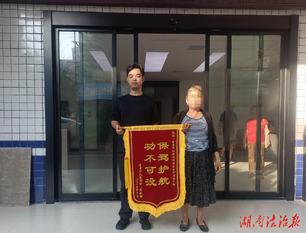 湖南法治报讯(通讯员 宁静 杨景涵)10月11日上午8点30分左右,市民张女士来到吉首市公安局峒河派出所,将一面写有“保驾护航 功不可没”的锦旗送到民警手中,以表达对民警及时救助其儿子高某、帮助他重拾生活信心的诚挚谢意。