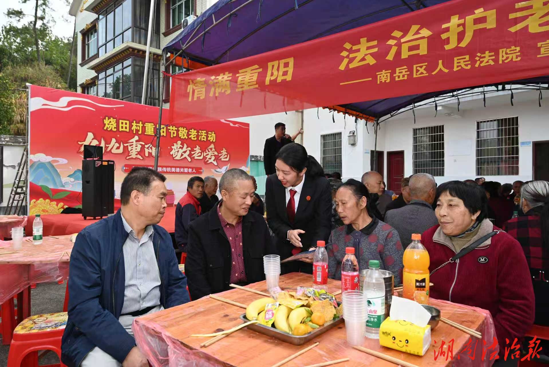 湖南法治报讯(通讯员 车璐炀 唐婧)为弘扬中华民族尊老敬老传统美德,切实维护老年人合法权益,在重阳节当天,南岳区人民法院前往烧田村开展了以"情暖重阳 法治护老"为主题的重阳节普法宣传活动。