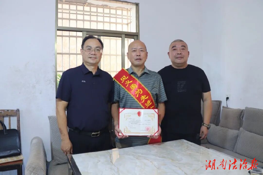 “您在人民群众身处危难之际,伸出援助之手,行见义勇为之举,传承了中华民族传统美德,身体力行地向社会传递正能量,党和政府感谢您!”市委政法委相关负责人来到事发现场,详细询问施救经过,对王志春不顾个人安危、挺身而出的行为给予高度赞扬;同时,为他送上慰问金,并颁发见义勇为行为确认证书,勉励他继续发扬引领示范作用,传递社会正能量,为建设更高水平的平安娄底贡献更多力量。
