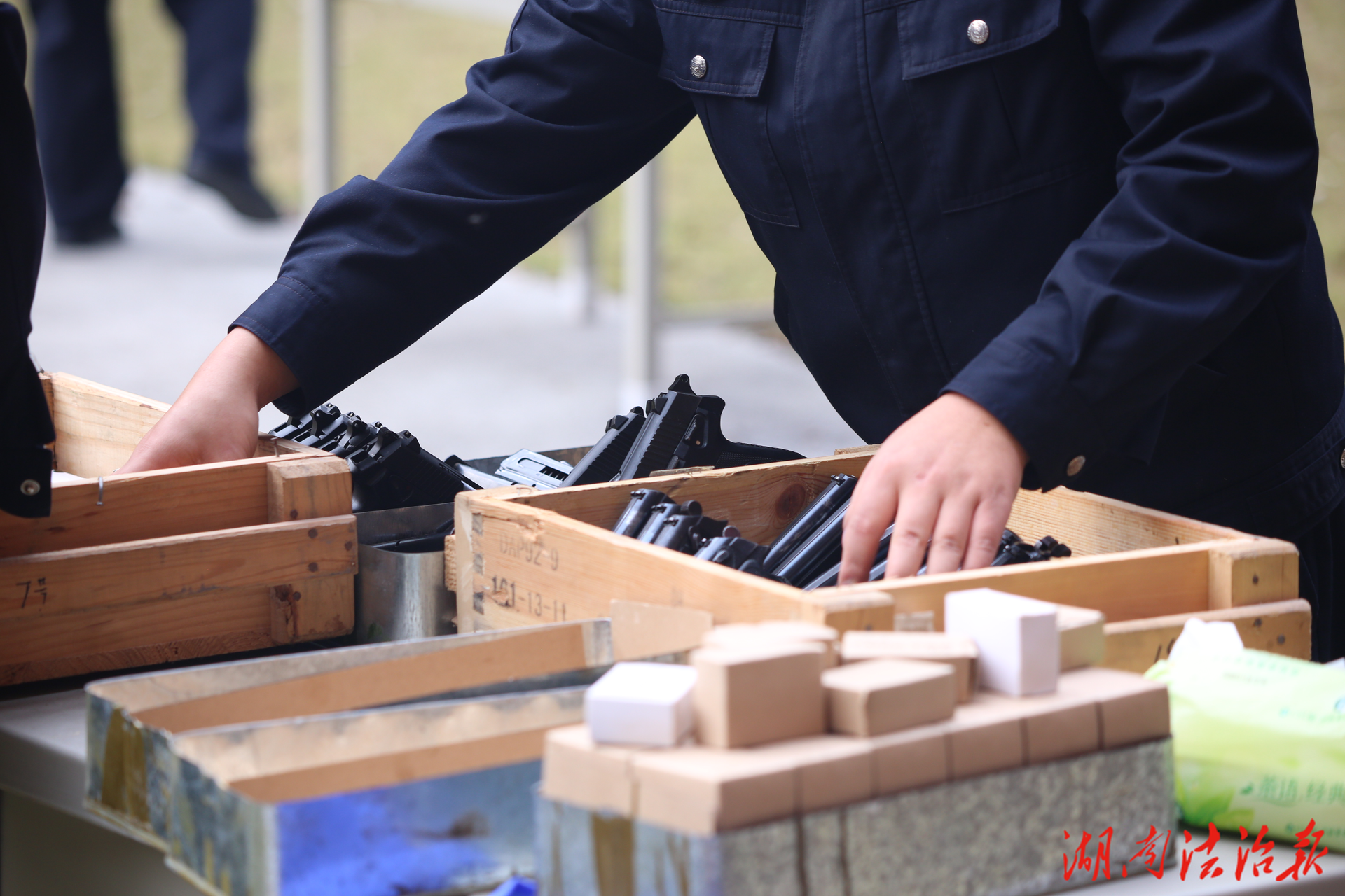 政工、治安、巡特警等部门密切协作,科学制定考核方案,在人员编组、枪弹保障等环节均实现全流程闭环管理。考核在指定靶场进行,使用64式、77式、92式手枪开展15米立姿无依托应用射击,采取“边学边练、训考结合”方式组织实施。考核前,现场指挥员详细讲解射击纪律、安全事项及考核规则,明确靶位分配与成绩评定标准,并现场示范持枪、瞄准、击发等全套动作要领,确保训练全程“零隐患”。