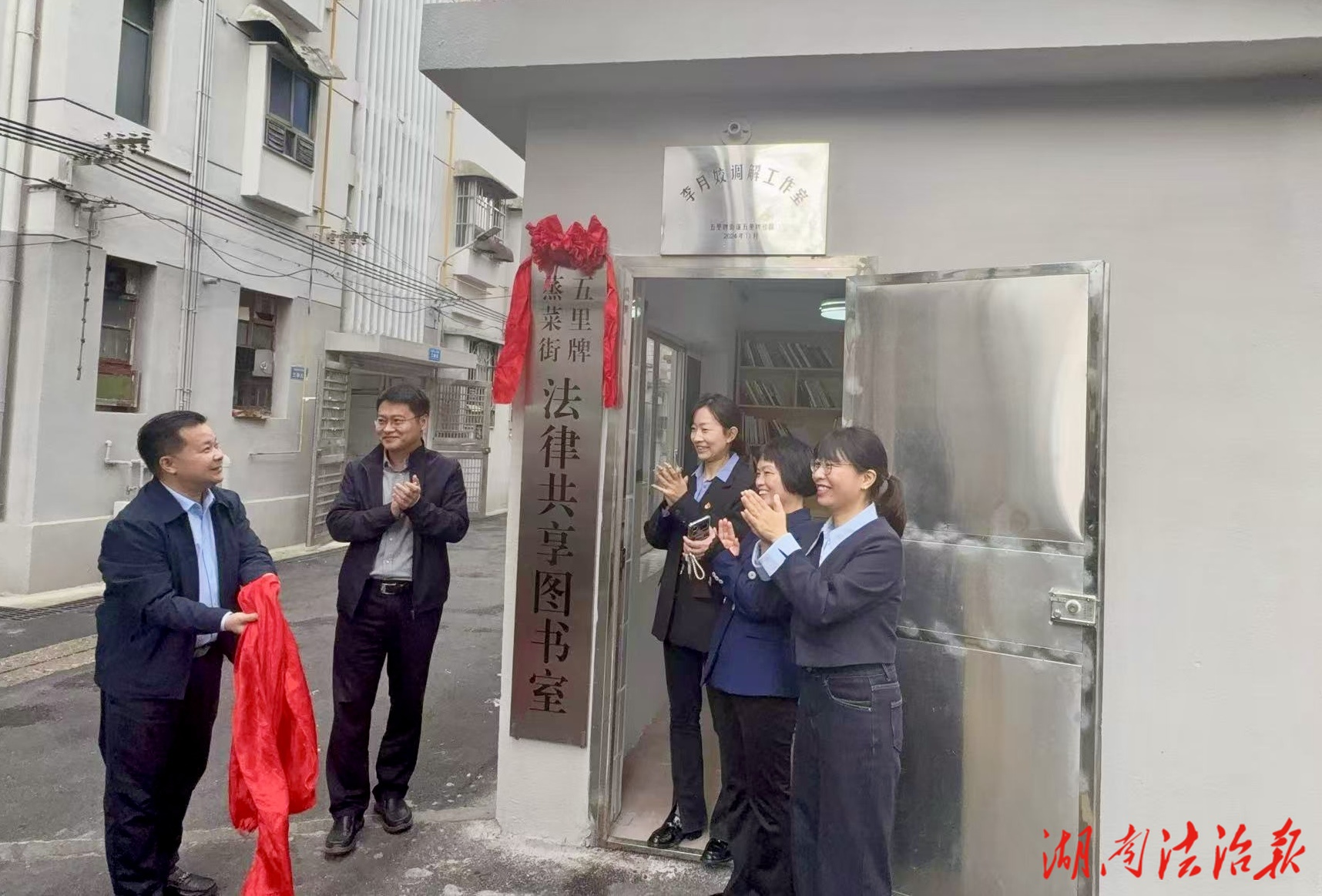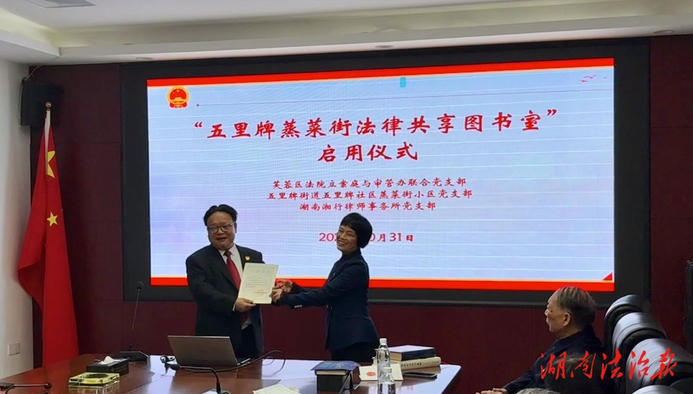 湖南法治报讯(通讯员 黄丽 摄影 邹睿智)在深入贯彻落实党的二十大精神、全面推进基层治理现代化的背景下,2025年10月31日上午,长沙市芙蓉区五里牌街道五里牌社区蒸菜街小区党支部,携手芙蓉区法院立案庭与审管办联合党支部、湖南湘行律师事务所党支部,于远大一路中铁十八局会议室共同举行“五里牌蒸菜街法律共享图书室”启用仪式。此次活动以党建为纽带,融合法治力量,共同开启支部联建共建新篇章,为社区党员带来一场温暖而充实的法治文化体验。