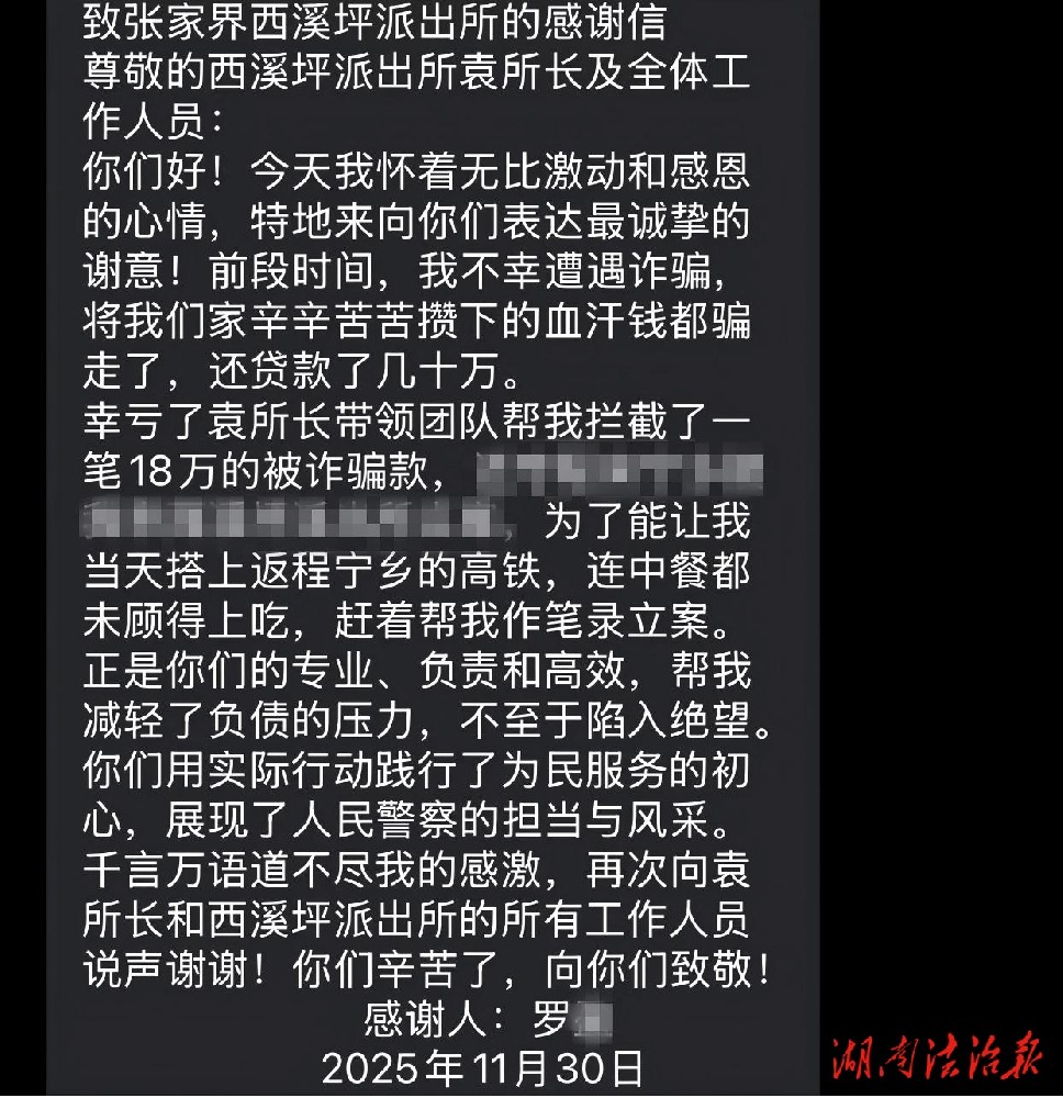 “正是你们的专业、负责和高效,为我减轻了负债压力,让我重燃希望!”感谢信中,罗女士反复提到民辅警的敬业与温情。她表示,西溪坪派出所真正践行了“人民公安为人民”的庄严承诺,展现出新时代警队的风采与担当。