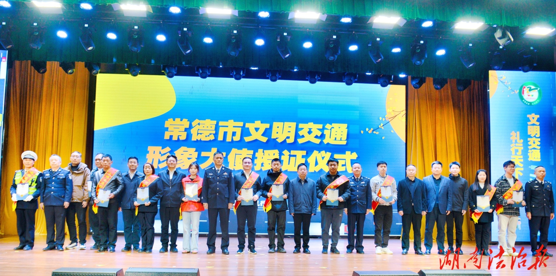 活动中,由全国特级优秀人民警察、全国公安系统二级英模曾祥富带领8名交通管理示范岗民辅警展示创建成果,来自公安交管、运输企业、快递外卖、文明交通志愿者、保险行业以及学生家长的代表,共同宣读了《“文明交通,礼行天下”倡议书》。现场还为15名常德市文明交通形象大使颁发了聘书。